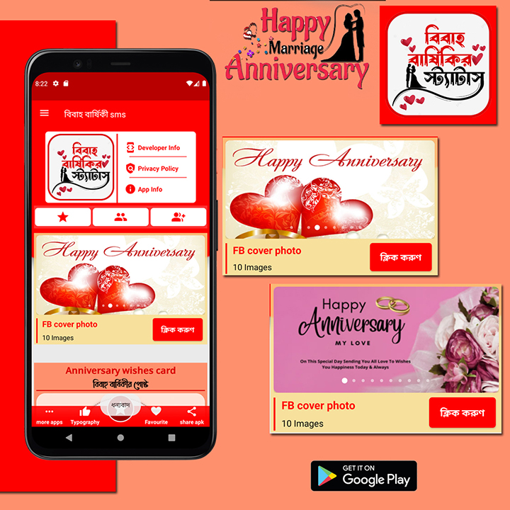 এখনি ডাউনলোড করে নিয়ে নিজের বিবাহ বার্ষিকী উদযাপন করুন। আপনার প্রিয়জন বন্ধু-বান্ধব ও ভাই-বোন ، বাবা-মা সহ সকলকে বিবাহ বার্ষিকীর শুভেচ্ছা জানান। সাথে বিবাহ বার্ষিকি ছবি ভিডিও করে রাখুন ভবিষ্যতের জন্য। ধন্যবাদ