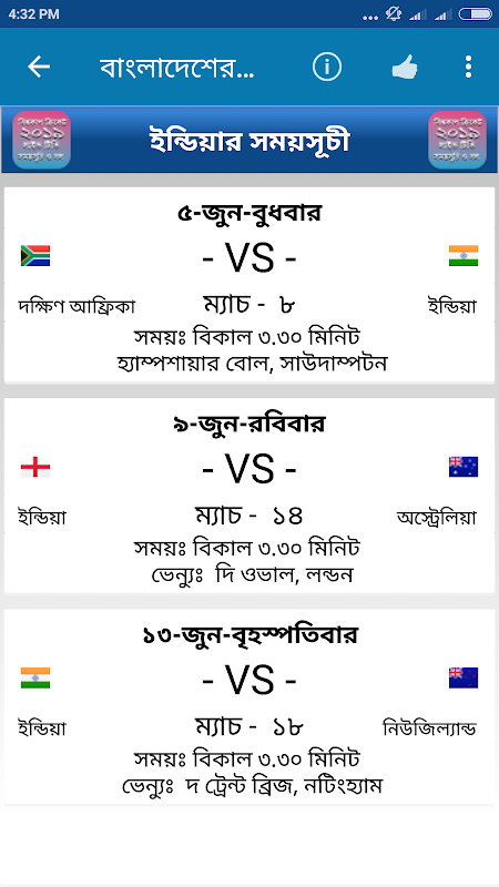 বিশ্বকাপ ক্রিকেট ২০১৯ লাইভ টিভি । World Cup 2019 । বিশ্বকাপ ক্রিকেট ২০১৯ এর সময়সূচি, ১০ টি দল ও সকল দলের খেলোয়াড়দের নামের তালিকা, প্রত্যেক দলের আলাদা সময়সূচী, লাইভস্কোর, লাইভ টিভি, পয়েন্ট টেবিল, স্টেডিয়াম, টিকেটের মূল্য ও সকল রেকর্ড ও তথ্য নিয়ে ইউজার ফ্রেন্ডলি অ্যাপ।