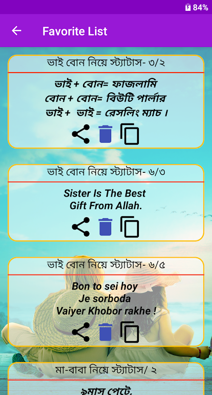 আসসালামু আলাইকুম কেমন আছো সবাই। ভাই বোন নিয়ে স্ট্যাটাস- অ্যাপটি তে রয়েছে নিত্য নতুন কন্টেন্ট، ভাই ও বোনদের মিষ্টি সম্পর্ক ও হালকা হালকা মিষ্টি ঝগড়া দিয়ে সাজানো হয়েছে প্রত্যেকটি স্ট্যাটাস، ভালো লাগার মতো একটি অ্যাপস- এই অ্যাপটি বানানোর আগে অনেক রিসার্চ করা হয়েছে কোথাও এই রকম নাই অ্যাপ পাওয়া যায় নাই ، তাই আমি নিজেই অনেক মেহনত করে এই অ্যাপটি বানালাম আপনাদের সকলের জন্য- একটু উদাহরণ দেই- বোন তো সেই হয় যে সর্বদা ভাইয়ের খবর রাখে। কোন ভাই চায় না তার বোন কারো কাছে অসম্মানিত হোক।