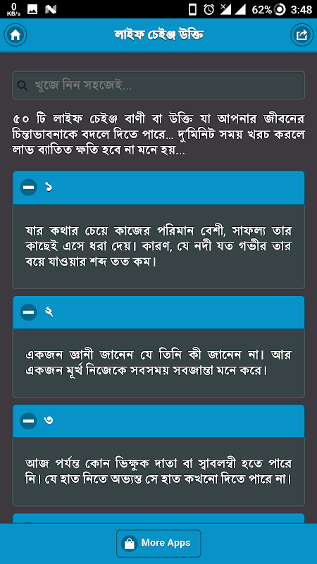উক্তিগুলো একবার হলেও পড়া উচিত আপনার।বিখ্যাত ব্যাক্তিদের কিছু উক্তি। উক্তিগুলো একবার হলেও পড়া উচিত আপনার।হয়তো এই উক্তিগুলোর কোন একটি আপনার জীবনের দৃষ্টিভঙ্গি পরিবর্তন করে দিতে পারে। অ্যাপটিতে রয়েছে কিছু দেশী বিদেশী প্রবাদ এবং বিখ্যাত মণীষীদের অনুপ্রেরণামুলক বাণী বা উক্তি যা আমাদের জীবনে প্রয়োগ করলে হয়তো আমাদের জীবন অনেক সুন্দর হয়ে উঠবে।জীবনে সফল ব্যক্তি হতে চাইলে মনে রাখুন এই সকল উক্তি গুলোএখানে দেওয়া প্রেরণা্মূলক উক্তিগুলো আপনাকে কাজে নেমে পড়ার উদ্যম যোগাবে।নিজের লক্ষ্য ও স্বপ্নকে আপনার আত্মার সন্তান হিসেবে লালন করুন, এগুলোই আপনার চূড়ান্ত সাফল্যের নকশা হবে।আর দেরি না করে তাহলে চলুন পড়ে আসা যাক উক্তিগুলো।