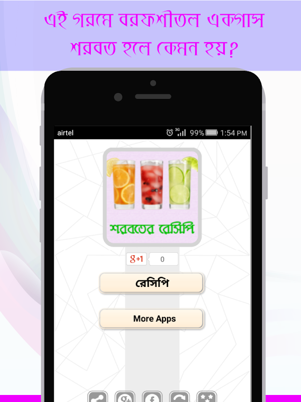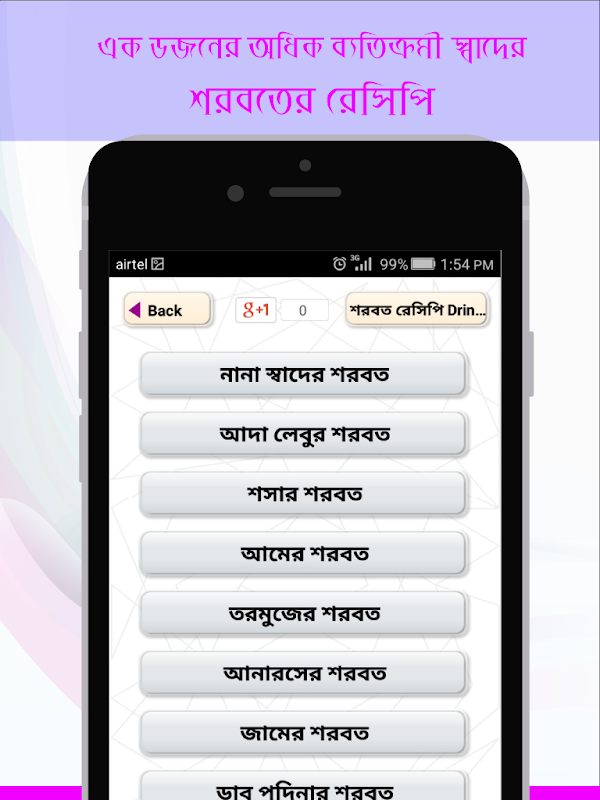 In a hot and humid day taking a glass of ice cool drink (sorbot) is a great way to get refreshed. Especially, in iftar of ramadan a homemade cold drink is very refreshing. It is also part of eid recipe. A good beverage can help to weight loss, good for stomach and skin care. It is used in health tips bangla as herbal medicine bangla for long time. Drink could be good for heart and treatment of disease in bengali. Many people consider it as skin care beauty tips in bangla also. This beverage may be of many types, made by many ingredients each one offering a different taste. In this app, we are going to demonstrate hands on how to make different drinks.