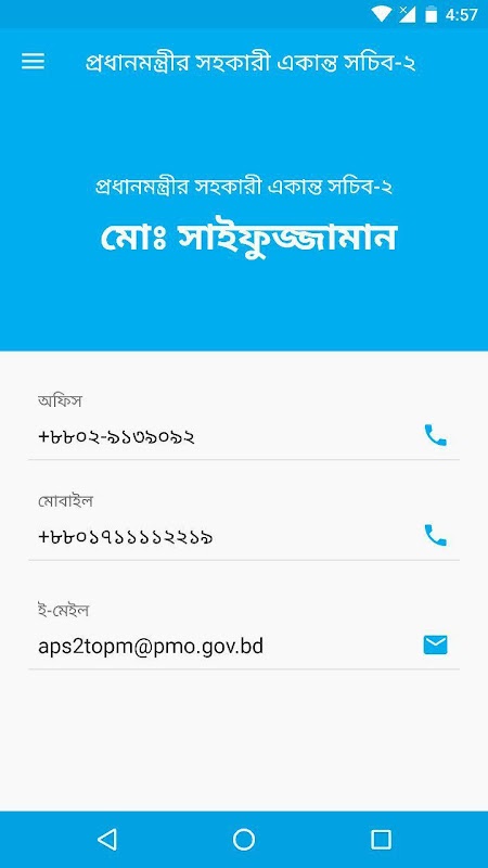 অ্যাপটিতে সকল তথ্য সাতটি অধ্যায়ে সুবিন্যস্ত রয়েছে, যার মাঝে খুঁজে পাওয়া যাবে সরকারি এবং বেসরকারি বিভিন্ন প্রতিষ্ঠান ও কর্মকর্তার গুরুত্বপূর্ণ ফোন নাম্বার, ইমেইল ঠিকানা, ফ্যাক্স এবং ওয়েবসাইট। আরো রয়েছে শিক্ষা বিষয়ক আলাদা আলাদা তথ্য। রয়েছে বিভিন্ন মন্ত্রনালয় ও সরকারি কর্মকর্তাদের সাথে যোগাযোগের ব্যবস্থা।