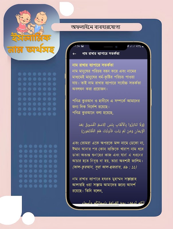 اكتشف الأسماء الإسلامية ذات المعاني - بما في ذلك أسماء الأولاد والبنات المسلمين، وأسماء الأطفال القرآنية والعربية والبنغالية - في تطبيق إسلامي لأسماء الأطفال مصمم بشكل جميل.