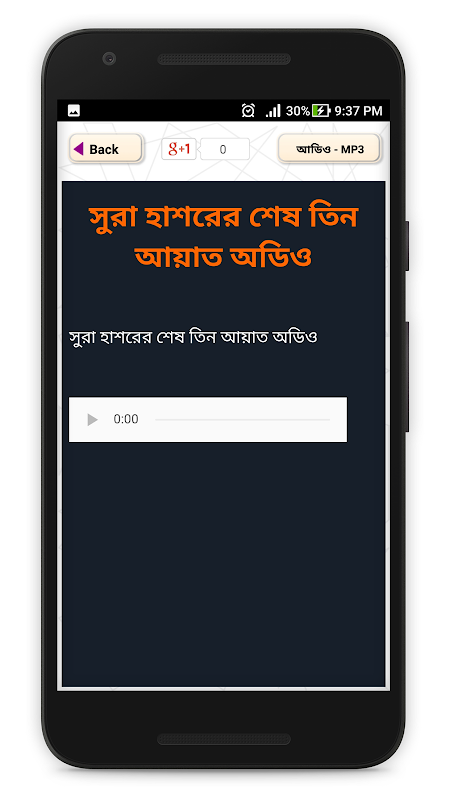 sura hasor last 3 ayat is an educational applicaton. Sura hasor is very important for all muslim. Sura hasor bangla pronunciation is given here. Sura hasor mp3 also included. Sura hasor last 3 ayat audio is recited here so nicely. Surah hashr last 3 ayal has a lots of benefit. Surah hashr should known by all of us surah hashr last 3 ayat bangla is very easy to understand. Surah hashr last 3 ayat audio can be listen when you will stay online. Without internet shrah hashr audio can’t be played. But you can read both arabic and bangla from this app.