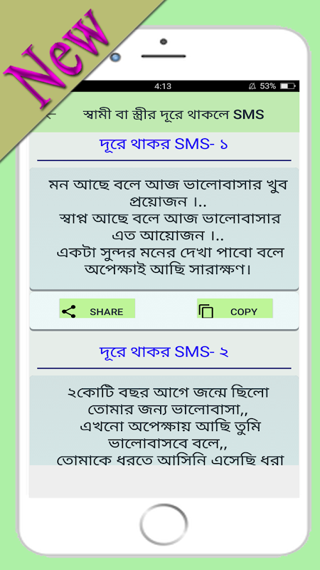 এইটি শুরু হওয়ার আগেই তা ভেঙ্গে ফেলুন। আপনার স্ত্রীর প্রতি আপনার ভালবাসা প্রকাশ করুন ।মুখে অনেকে ভালবাসার কথা বলতে পাড়েন না।। তাদের জন্য আমার এই অ্যাপ্লিকেশন ।এই অ্যাপ্লিকেশনে স্বামী স্ত্রীর সব ধরনের এসএমএস পাবেন।