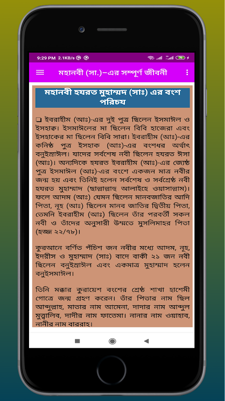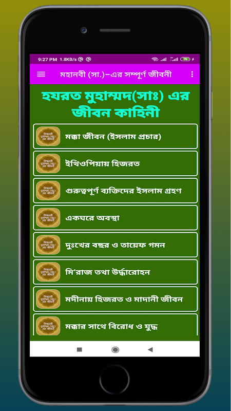 Nobijir jiboni Bangla هي حياة النبي محمد في تطبيق البنغالية. حيث ستحصل على سيرة ذاتية قصيرة لحضرة محمد صلى الله عليه وسلم. من nobijir jibon kahini يمكننا تعلم الكثير من الأشياء لجعل حياتنا مستنيرة. نحن نعلم أن الحديث هو نبجير بني لذلك نحتاج إلى معرفة كل بني النوبير والتعلم منهم. يمكنك استخدام تطبيق bisso nobir jiboni هذا في وضع عدم الاتصال بالإنترنت أيضًا ويمكنك مشاركته مع أصدقائك. من nobijir نماز يمكننا الحصول على فكرة عن الصلاة. من هذا التطبيق يمكنك أن تقرأ عن تاريخ النبي محمد منذ الولادة حتى الموت.