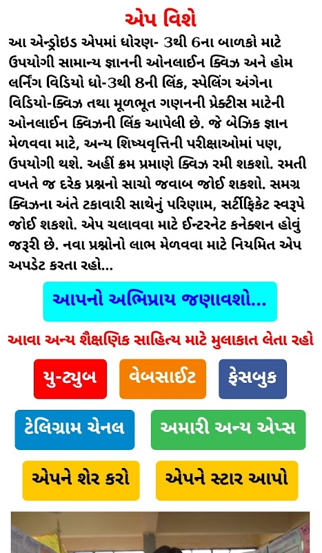 إنه تطبيق مسابقة المعرفة العامة الغوجاراتية عبر الإنترنت للمعيار 3 إلى 6. لا توجد إعلانات ..