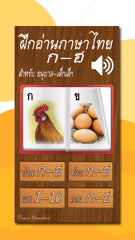 تطبيق للتدرب على قراءة اللغة التايلاندية ، نطق g. oi ، g. kai ، إلى h. owl ، عيون كبيرة ، مما يجعل الأطفال ينطقون جميع الحروف الساكنة التايلاندية الـ 44 بشكل صحيح مع الصور الحقيقية.