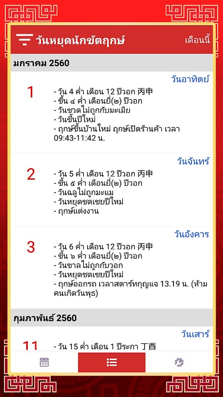 تطبيق الأيام الميمونة - التقويم 2025 هو تطبيق تقويم تايلاندي - تقويم ميمون - التقويم الصيني 2025 يساعد على معرفة الأيام الميمونة، والأيام الجيدة، والفنغ شوي الجيد، وهو مناسب لأولئك الذين يبحثون عن وقت ميمون للانتقال إلى منزل جديد، والزواج، وفتح مشروع تجاري، شراء سيارة مهم من تايلاند عرض مختلف المهرجانات الهامة، والعطلات الرسمية، والأيام المقدسة البوذية، وتسجيل أوقات المواعيد في التقويم.