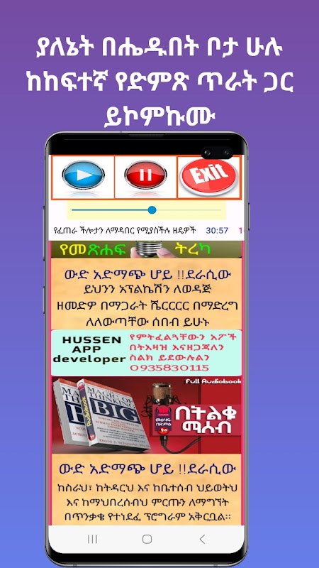 يحتوي هذا التطبيق على كتاب The Magic of Thinking Big ، وهو كتاب رائع باللغة الأمهرية في شكل سردي شهده ملايين الأشخاص حول العالم ، مما أدى إلى تحسين حياتهم.