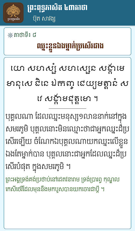 - ព្រះគាថាធម្មបទ គឺ ជាព្រះពុទ្ធភាសិដែលជាពាក្យដាស់តឿន ទូន្មានអប់រំ បើកផ្ងារបង្ហាញប្រាប់នូវការពិតក្នុងជីវិត ជាពាក្យ ពិតផងមានប្រយោជន៍ផង ជាពាក្យរបស់អ្នករំលត់នូវកិលេសអស់ហើយផង ។