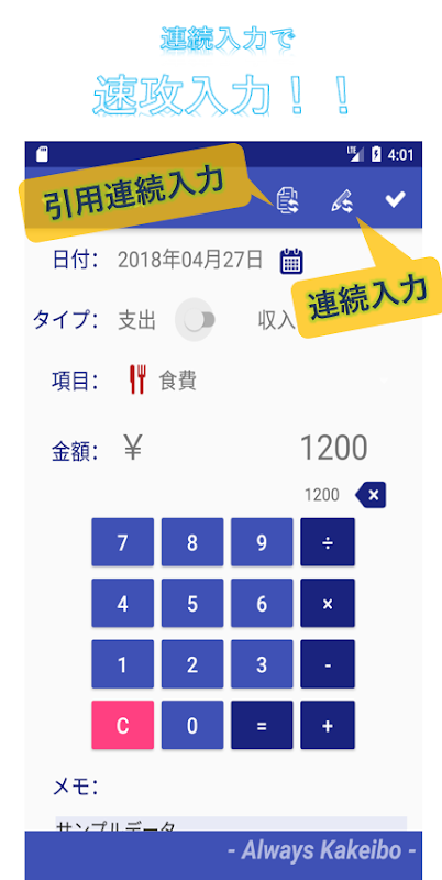 今まで家計簿が続かなかった方も、簡単に速く記帳ができるためぜひお試しください。