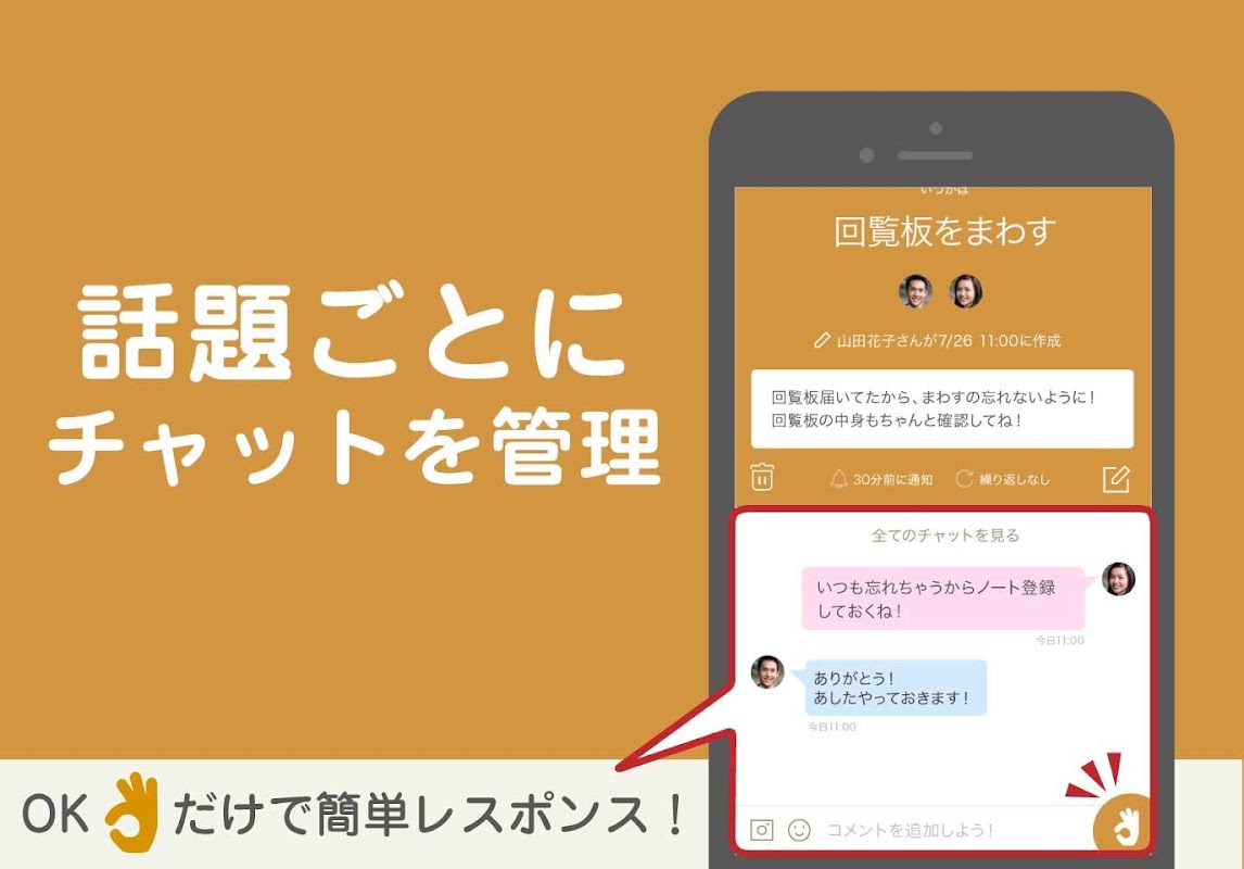今まで口頭やメッセージなどでバラバラに伝えていた夫婦間の「予定」「共有」「メモ」「相談」「お願いごと」などを一つのアプリで設定・編集・管理できます。