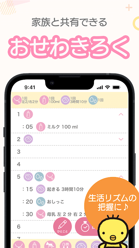 يمكنك تسجيل عناصر مختلفة أثناء رعاية الطفل مثل "الرضاعة الطبيعية" و"الحفاضات" و"الاستحمام" و"النوم" في الوقت الفعلي كل يوم، ويمكنك أيضًا مشاركتها مع شريكك.