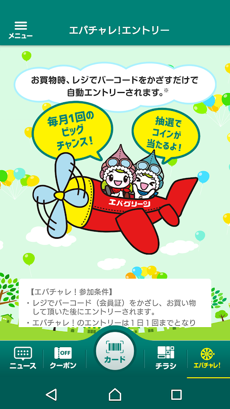 エバコイン、クーポン、チラシはもちろん、アプリ限定の「エバチャレ!」抽選も楽しめます。