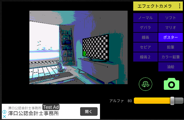 カメラの画像をリアルタイムに以下の10種類のエフェクトで表示して保存できます。