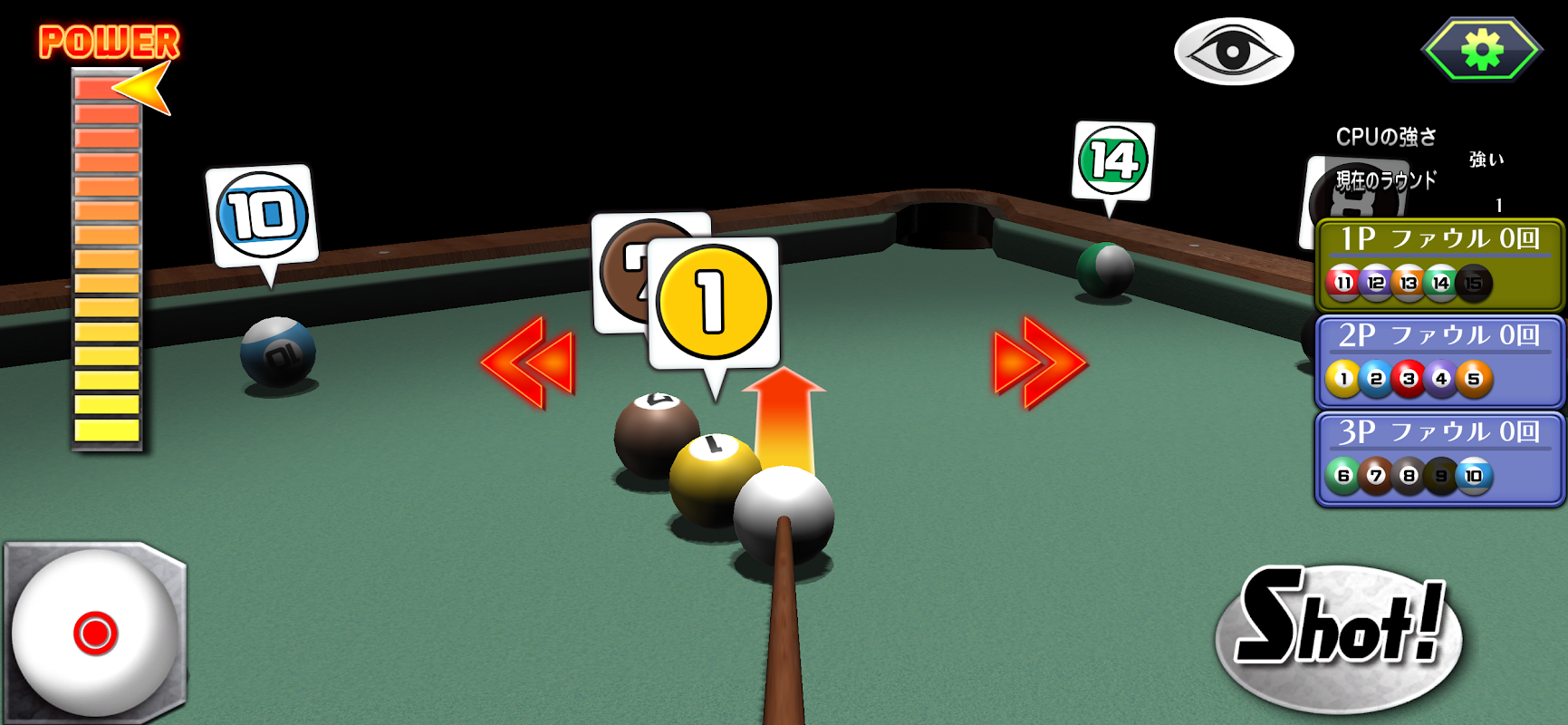 打つ強さ、撞点を変更してのひねりを活用できる、本格派3Dのビリヤード。