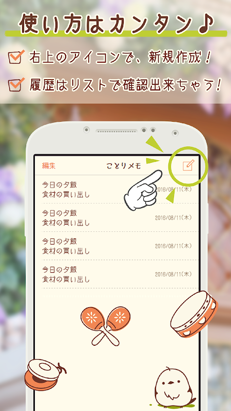 簡単シンプル&コトリが可愛いメモ帳アプリ。