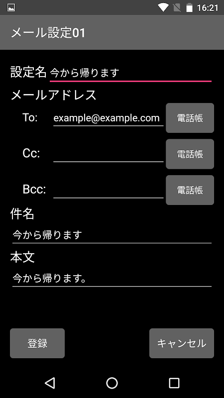 簡単な操作(ツータッチ)で定型メールを送信するアプリです。