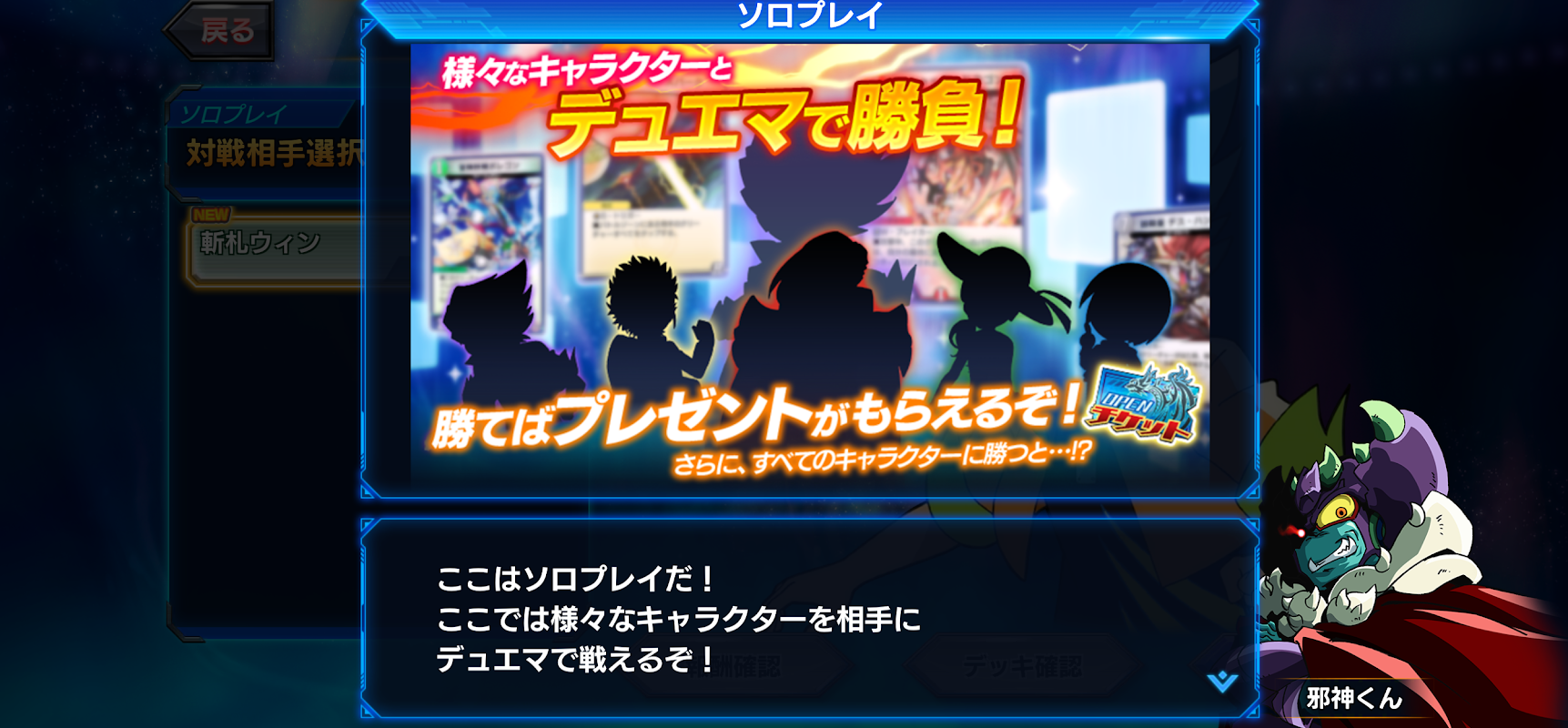 ゲームのチュートリアルをはじめ、プレイヤーは最初5種類の構築済デッキを使用し、COMキャラクターと対戦する事ができます!!