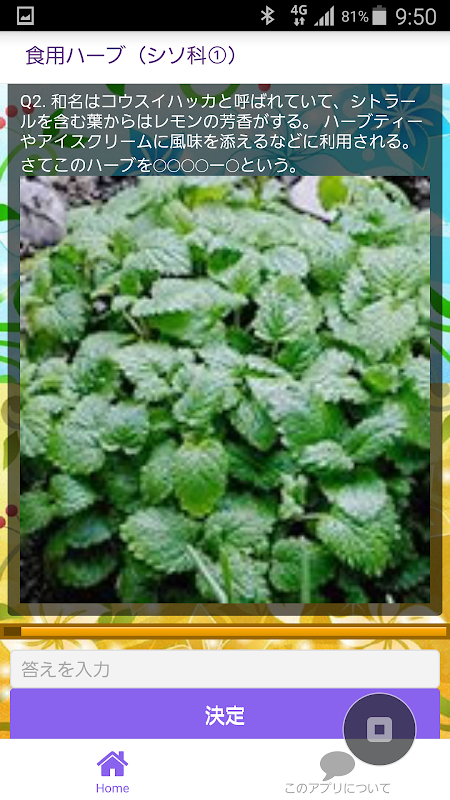 このアプリはアロマなどハーブのマメ知識を覚えるために、趣味で作成したクイズ形式のアプリです。ハーブについてしっていると女子力アップ。また疲れた体を癒してくれます