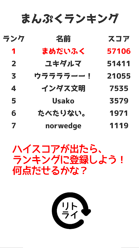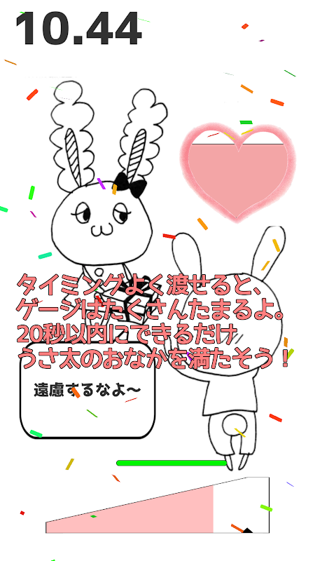 ギリギリを狙えば高得点。20秒以内に、できるだけ高いスコア(まんぷく度)をゲットしよう。