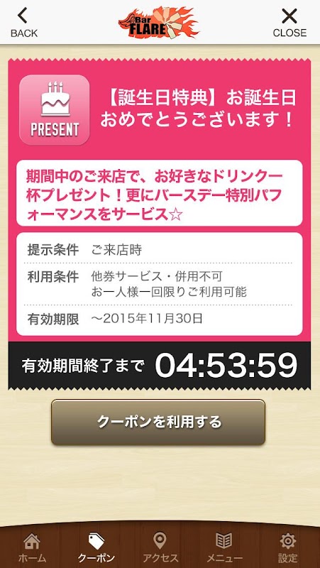 このアプリでは、バーフレアの色々な情報やアプリユーザー限定のお得なサービスが手に入ります!
