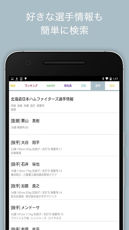 - 「選手」では球団所属選手の詳細情報が知れます。