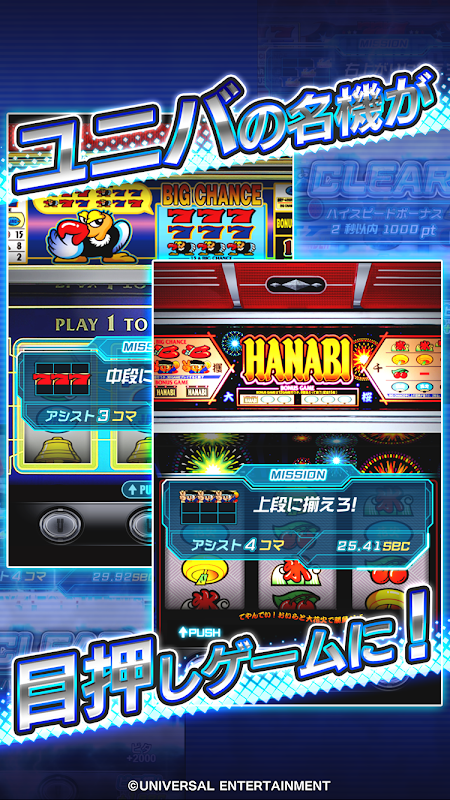 毎ゲーム出題されるミッションに従い、制限時間内にパチスロのリール図柄を止める「パチスロ目押しゲーム」