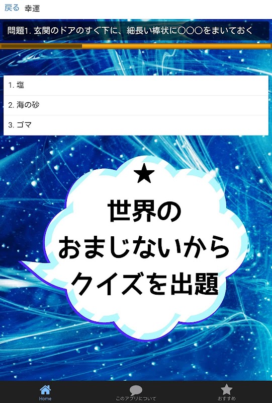 幸運、恋愛運、金運、健康運、いろいろの5つのカテゴリがあり、択一問題クイズが全18問あります。