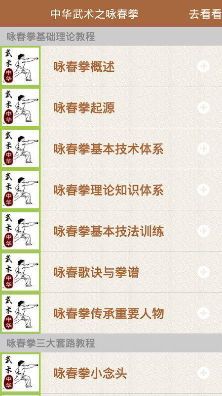咏春拳是以“中线理论”等理论基础为内容、而颇具特色的南拳拳术,强调使用正确的观念、意识及思维方式,来导出肢体的灵活应用;其内容主要包括“小念头”“寻桥”和“标指”等,主要练习方式为双人对练的“黐手”“黐脚”等;辅助器材有贴墙沙包、三星桩等;训练器械有木人桩、刀、棍等。