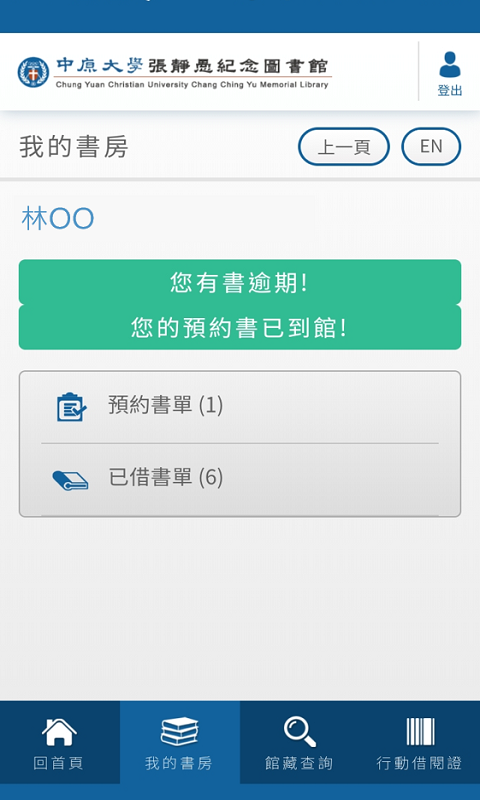 2. 我的書房:登入後,可顯示逾期及預約到館通知,另可檢視預約書單及已借書單,提供取消預約及續借功能。