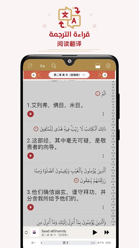 يمكنك تنزيل التطبيق وتصفح القرآن مع الترجمة الصينية بأبسط الطرق وأكثرها ملاءمة ، تصميم البرنامج جديد وأنيق ، وهو مصمم بشكل رائع من قبل أمهر الرسامين في العالم لنقوش القرآن.
