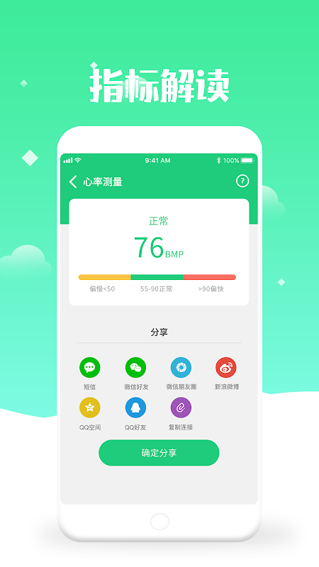 4.心率测量:有手机测量功能,也有手机输入,更有心率标准可供参考。