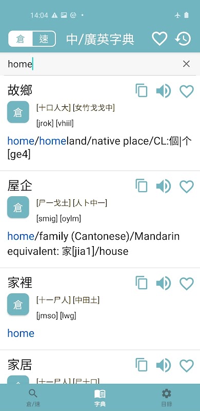 - قاموس اللغة الإنجليزية الصينية/الكانتونية: يحتوي هذا التطبيق على قاموس اللغة الإنجليزية الصينية وقاموس اللغة الإنجليزية الكانتونية المدمج، ويمكن للمستخدمين إدخال اللغة الإنجليزية للاستعلام عن الأحرف الصينية أو الكانتونية بالإضافة إلى رمز Cangjie والرمز السريع. يوفر هذا القاموس أيضًا شرحًا للنطق والكلمات لتسهيل استفسار المستخدمين وتعلمهم.