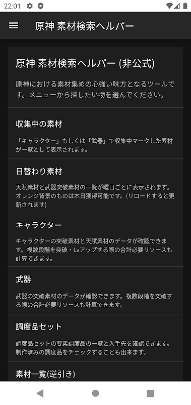 COGNOSPHERE PTE. LTD.より運営・開発されているオンラインゲーム「原神」における、素材収集を手助けするWebアプリです。