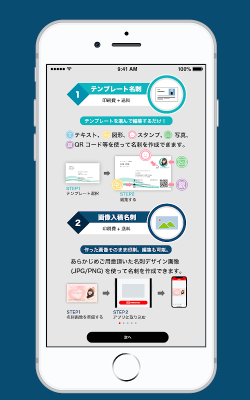 「名刺ショップドットコム」と同じアカウントが使用可能で、予め用意されたテンプレート(100種類以上)に文字や写真、スタンプを使って簡単に名刺の作成・注文ができ、過去に「名刺ショップドットコム」でご利用いただいた在版データをアプリから注文が可能です。ネット印刷で敷居の高かったIllustratorデータ(aiデータ)入稿に頼らない、様々な方法で名刺を作成・注文できます。