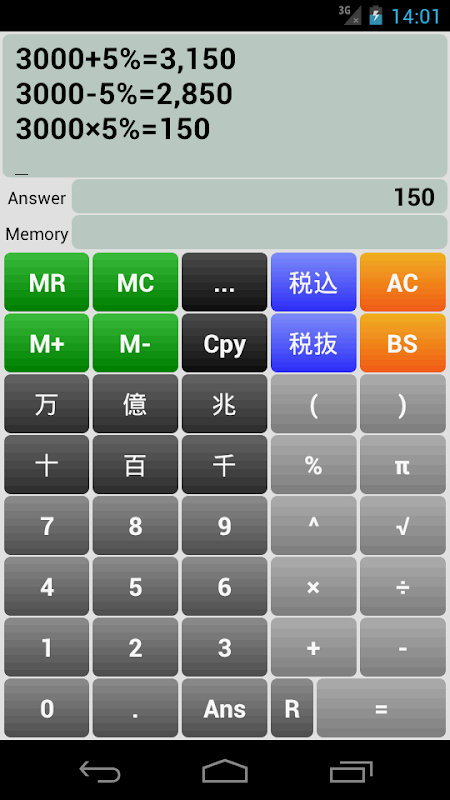 和桁電卓Freeは、十、百、千、万、億、兆といった漢数字による式の入力が可能な電卓アプリです。