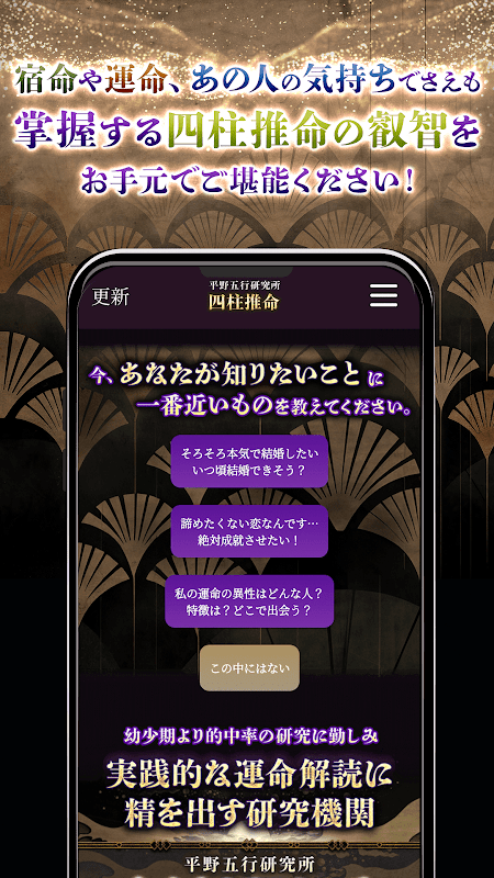 يدرس "معهد أبحاث هيرانو جوجيو" أسرار الكهانة ويسعى إلى تفسير عملي للمصير. شرح واضح للإجابات المستمدة من الكم الهائل من البيانات وقوة التقييم.