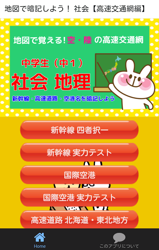 中学生向け勉強アプリで、中1で学習する社会の地理に関する問題集で無料アプリです。日本地図を使って空・陸の高速交通網を暗記しましょう。