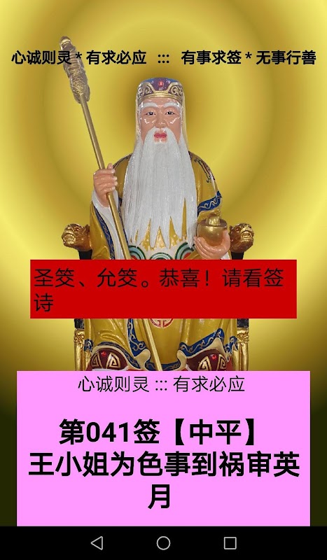 如果你遇事却无法到祠庙里求签,必然心急如焚。请下载这款手机应用程式随身备用,即可随时随地求签,趋吉避凶。只要心诚则灵,有求必应。有了这款手机应用程式备用,万一有事发生,可立刻求签。平时无事则不妨多行善积德。