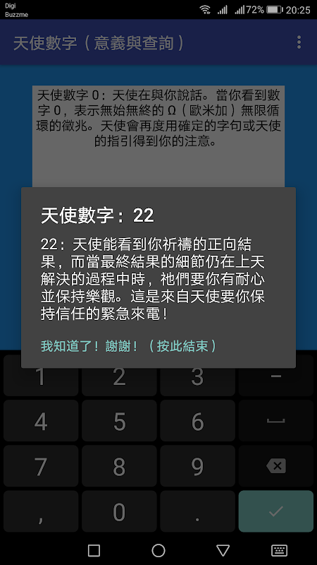 這是網上非常難得(也許是唯一的)能夠查詢中文正體字/繁體字天使數字意義的應用程式。本應用程式簡單實用,並收錄了 1 至 999 個天使數字的意義,供您查詢。(天使數字 0 已經呈現在首頁中。)