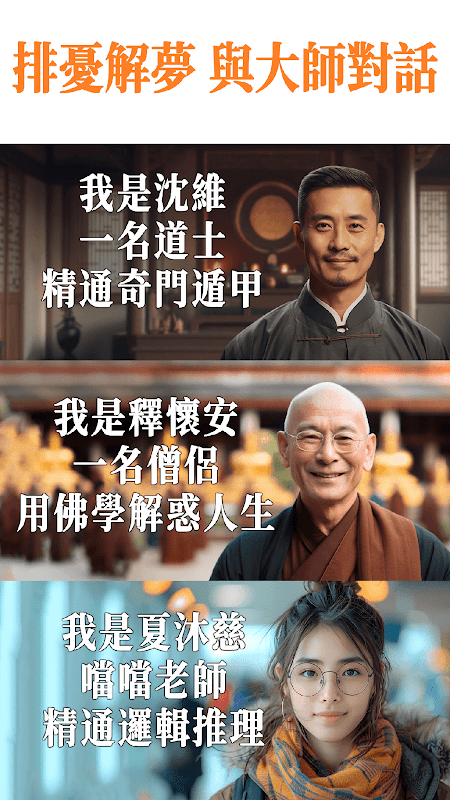 وهذا القسم منبر للحوار مع الحكماء. يعتمد "الاستشاريون" فيه جميعًا على أشخاص حقيقيين في الواقع، ويدمجون تكنولوجيا الذكاء الاصطناعي ونماذج التعلم العميق. وتشمل خلفياتهم الكهنة الطاويين والرهبان والمعالجين النفسيين وعرافي بطاقات التاروت وعلماء الأعداد والمحاضرين الجامعيين. إنهم ليسوا على دراية فحسب، بل تراكمت لديهم أيضًا تجارب وممارسات حياتية غنية، ويمتلكون حكمة متنوعة تشمل الدين وعلم النفس والميتافيزيقا.