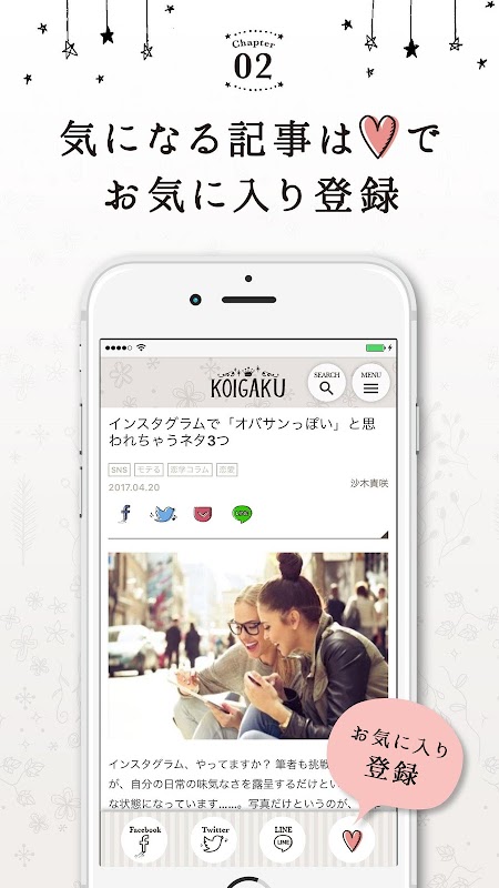 著名恋愛コラムニストの濃厚な恋愛コラムから、Twitterで数十万フォロワーを抱える人気インフルエンサーの恋愛相談など、読んだらすぐに一歩前へ踏み出せるコンテンツがいっぱいです。