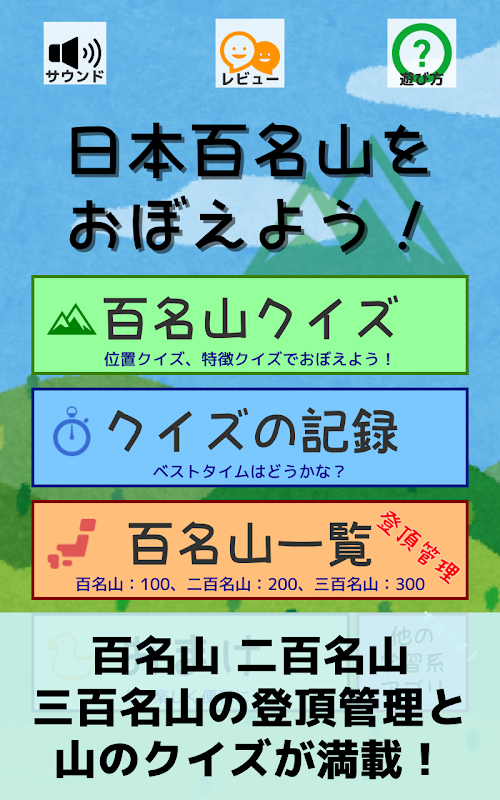 登山をやる人なら聞いたことのある『日本百名山』 百名山以外にも、二百名山、三百名山の登頂管理ができるよ 山の場所クイズもあって楽しい♪ 場所全部答えられるかな?