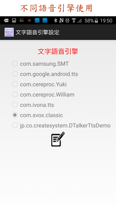 محرك النطق جوجل محرك الحرة المتاحة، ولكن إذا لم تتوفر باللغة الصينية، يجب شراء خاصة بهم