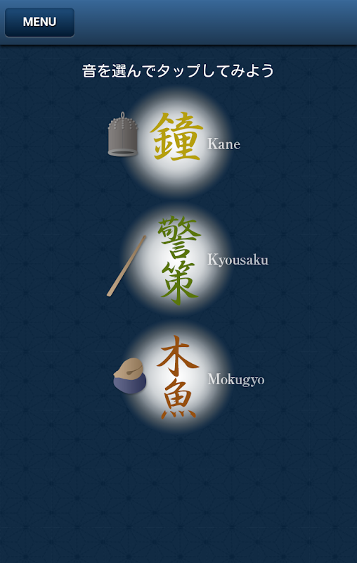 - نتمنى لكم واحد من بين ثلاثة من صوت الجرس / Kyosaku / الأسماك الخشبية، وسوف تسمع صوت عند النقر على الشاشة.