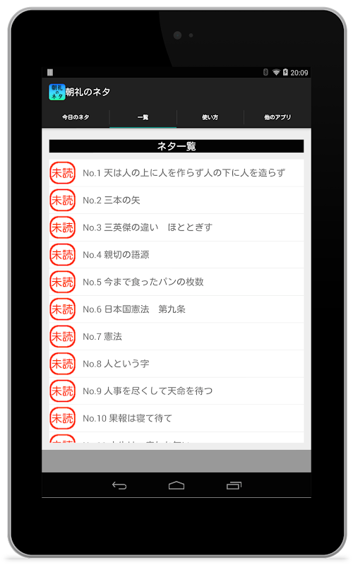 朝礼で何かをスピーチしなければならない。でも話のネタが無い。何でも良いから話のネタをくれ!という人の為のアプリです。起動すれば、ネタが1つ表示されます。