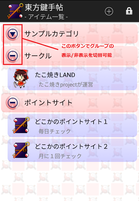 【東方鍵手帖】は東方キャラのアイコンが使用できる、パスワード管理ツールです。 1つのアイテムに対して、グループ管理や自由な見出しで上限ない項目の登録が可能です。