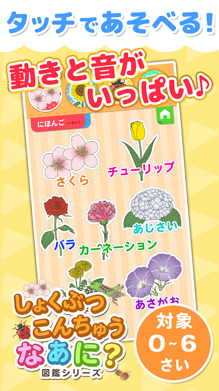 استمتع بالتعلم مع الزهور والحشرات المألوفة! التطبيق التعليمي مع الصوت الإنجليزية واليابانية!
